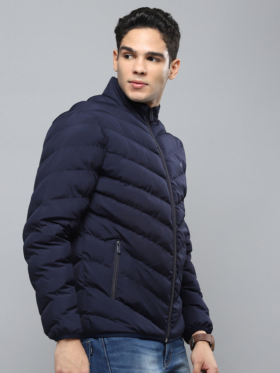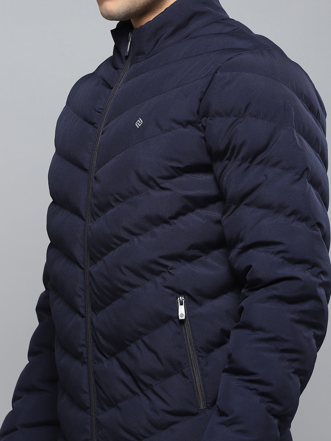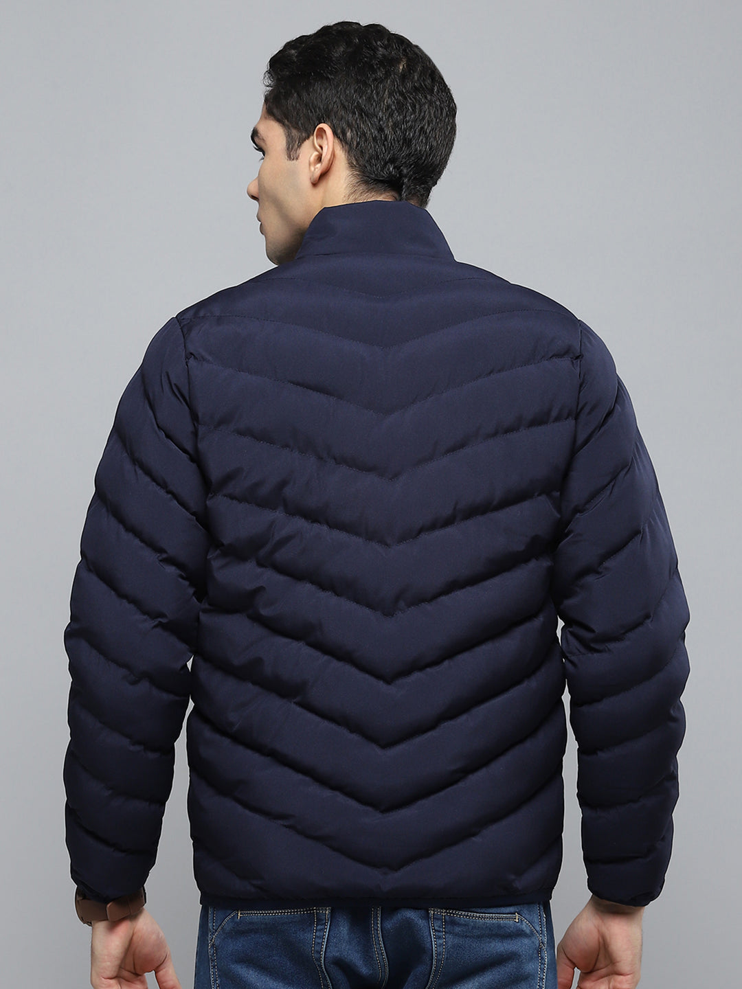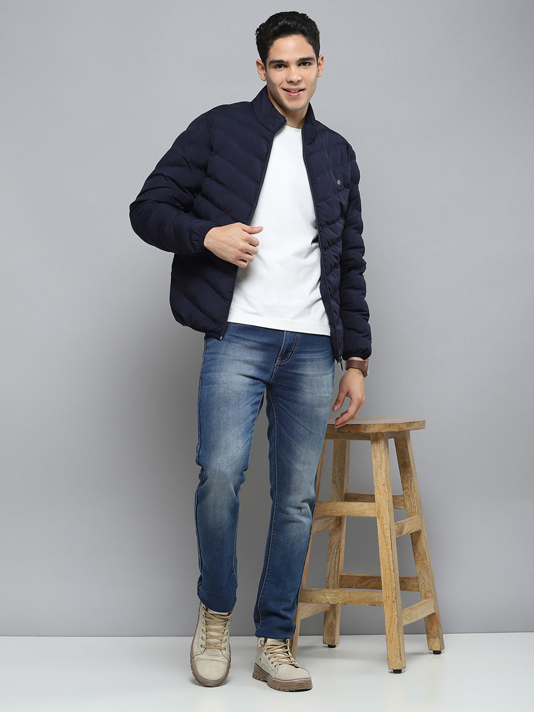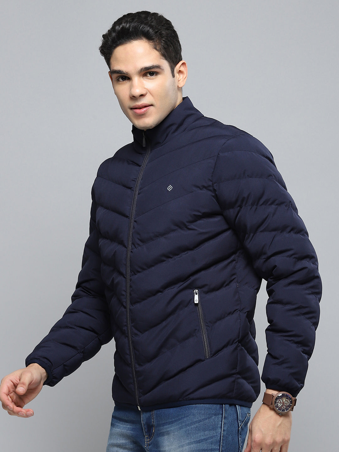 Men Navy Blue Solid Mock Neck Full Sleeve Jacket