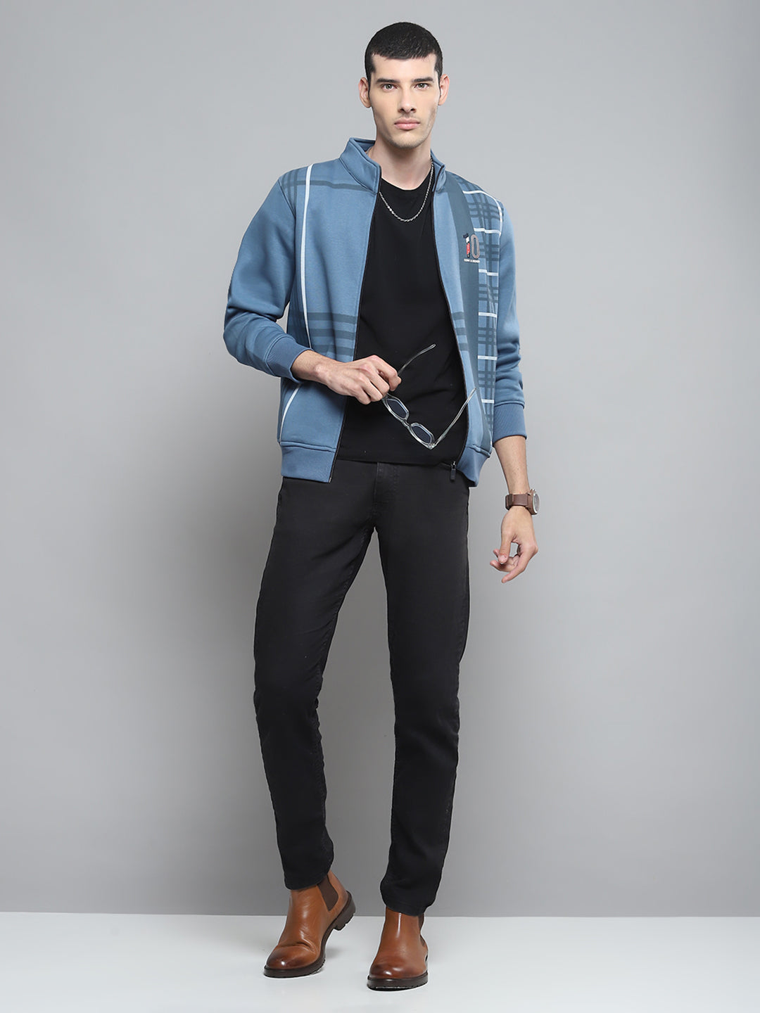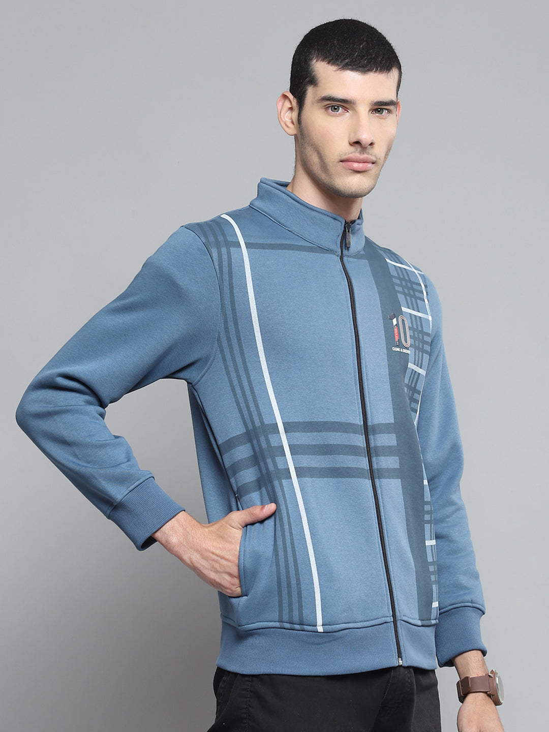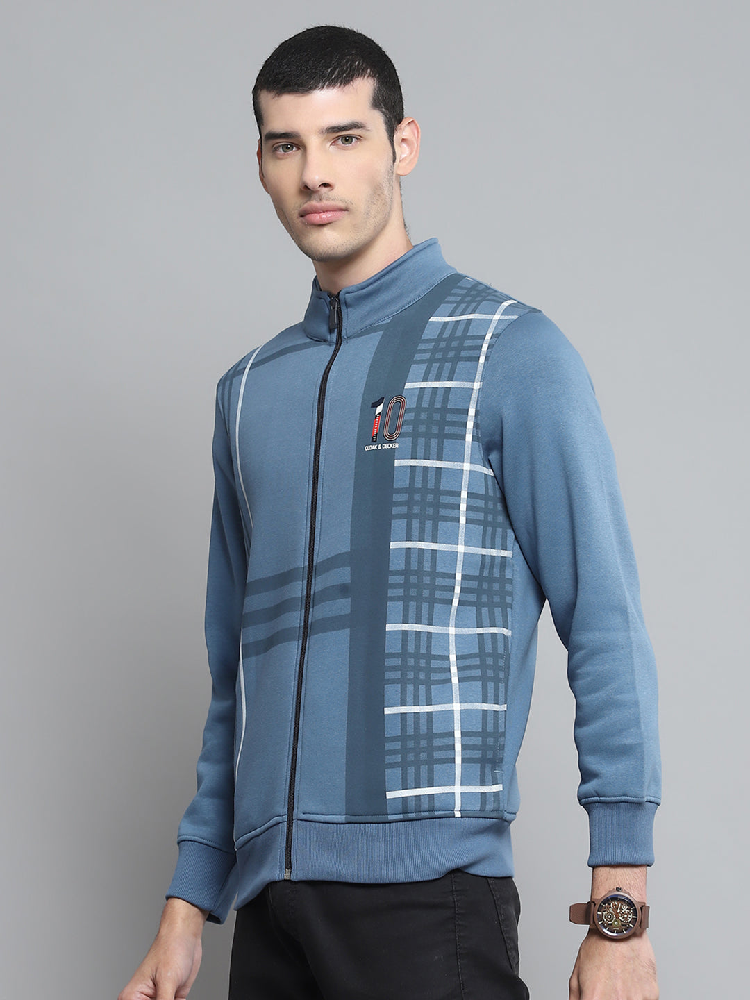 Men Blue Printed Mock Neck Full Sleeve Sweatshirt
