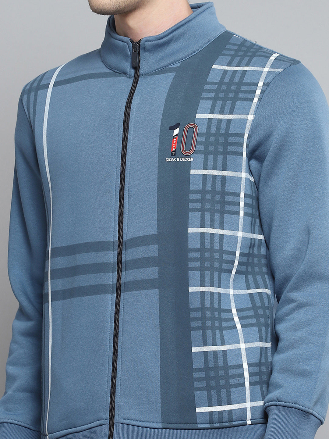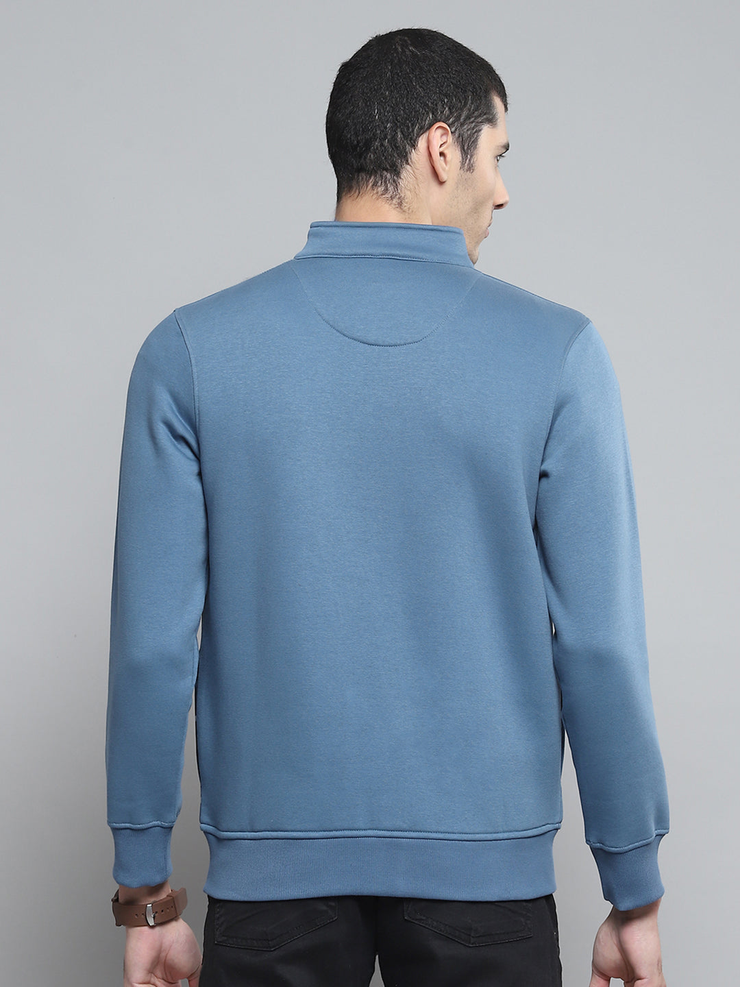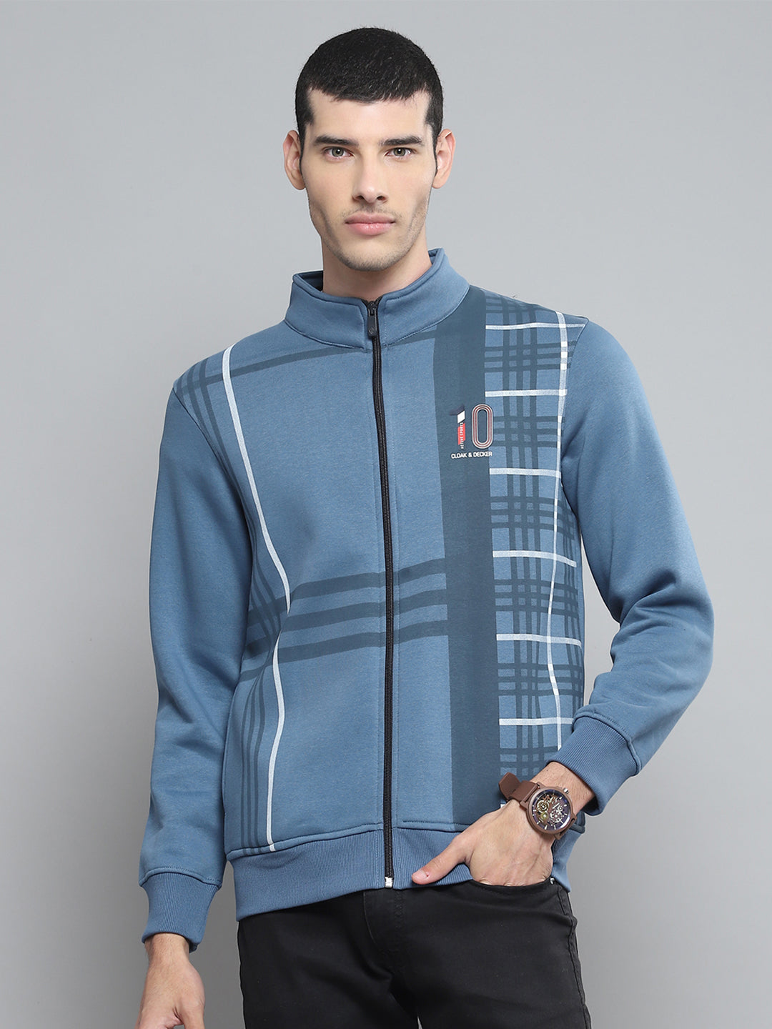 Men Blue Printed Mock Neck Full Sleeve Sweatshirt