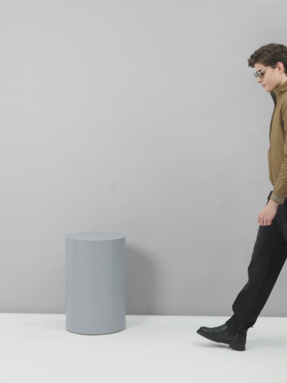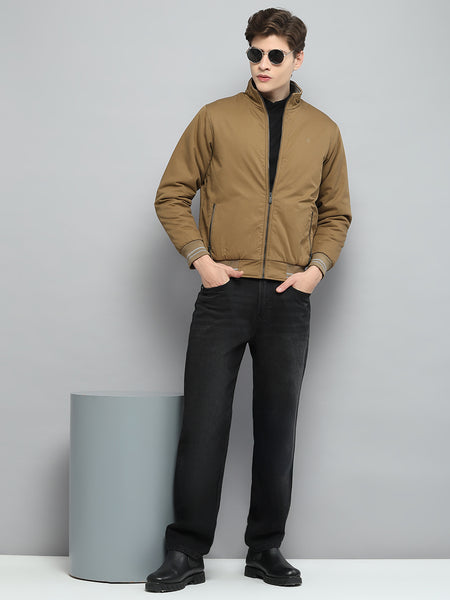 Men Khaki Solid Stand Collar Full Sleeve Jacket
