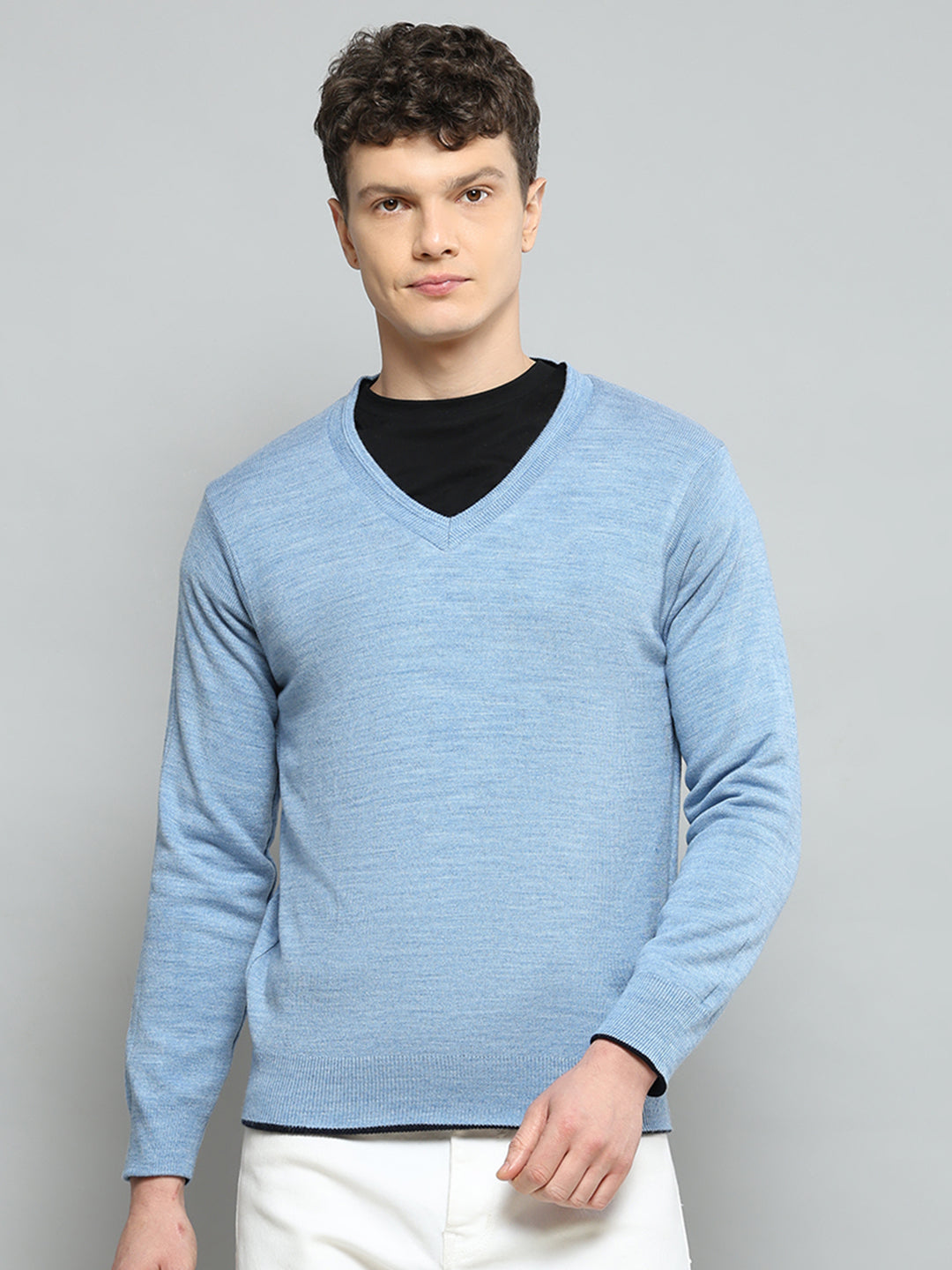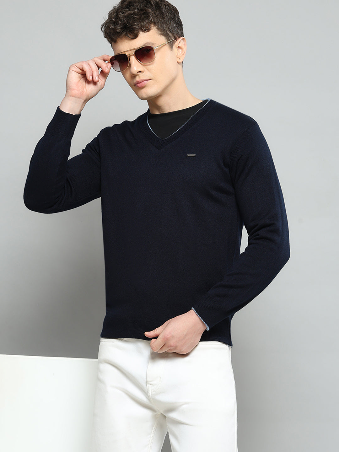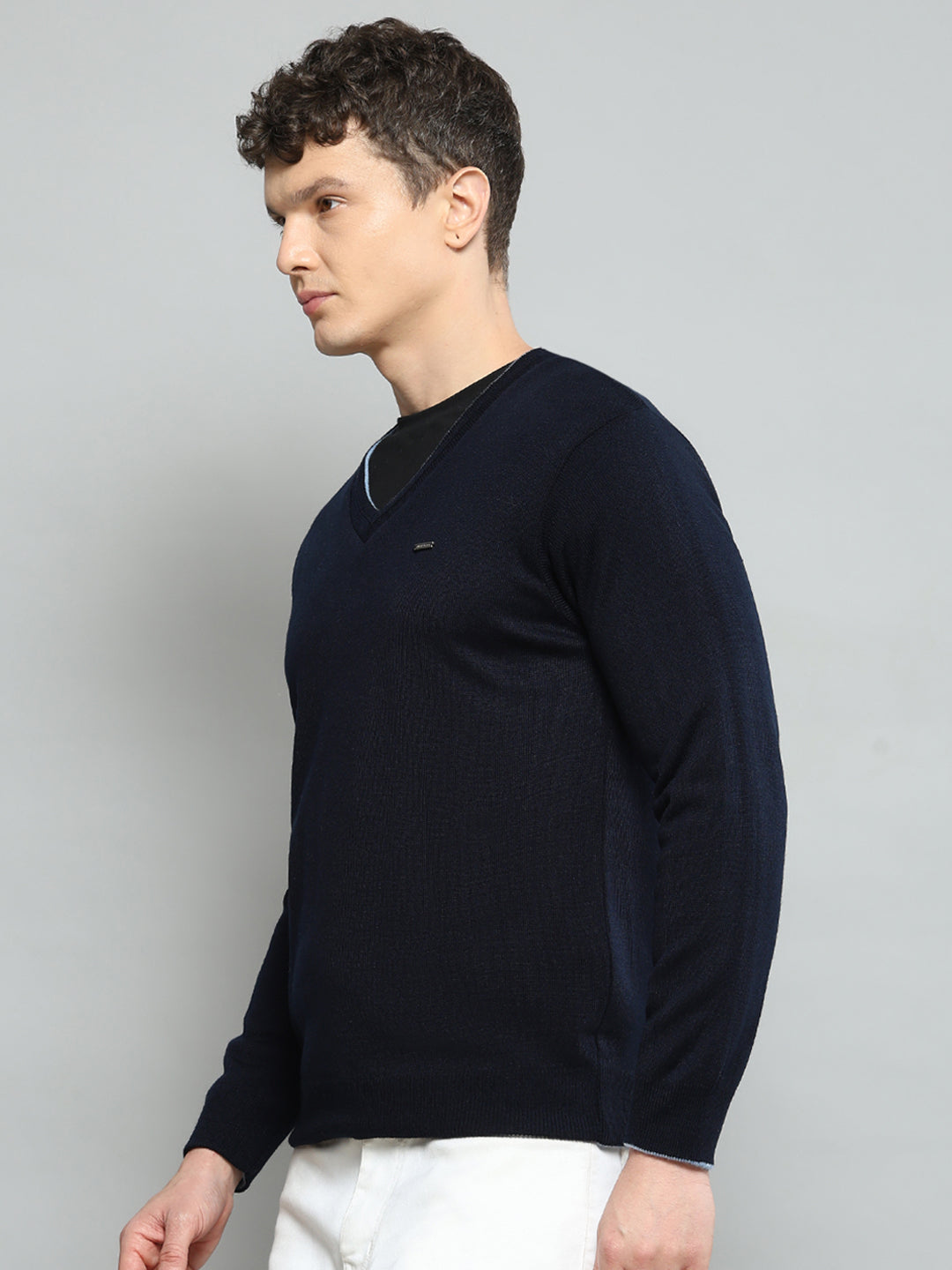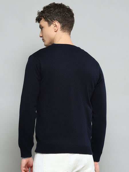 Men Navy Blue Solid V Neck Full Sleeve Pullover