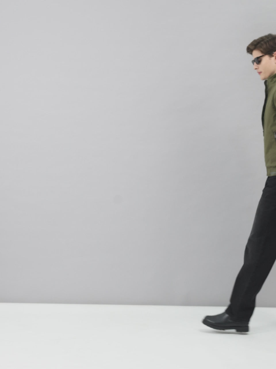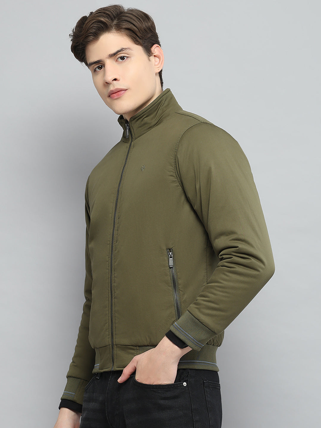 Men Olive Solid Stand Collar Full Sleeve Jacket