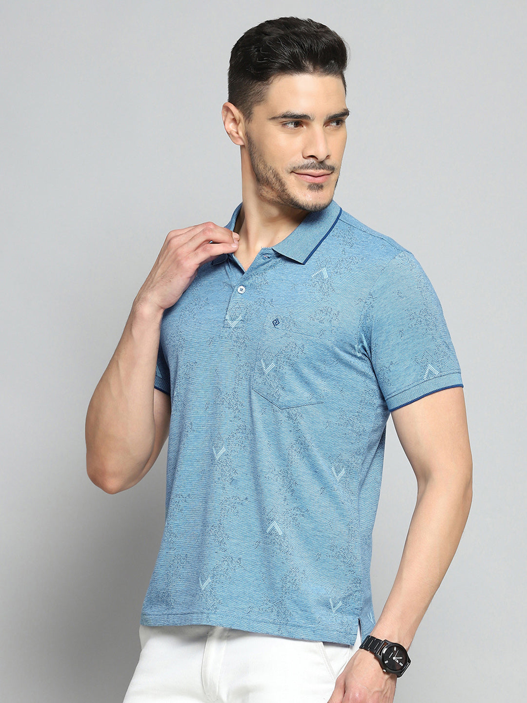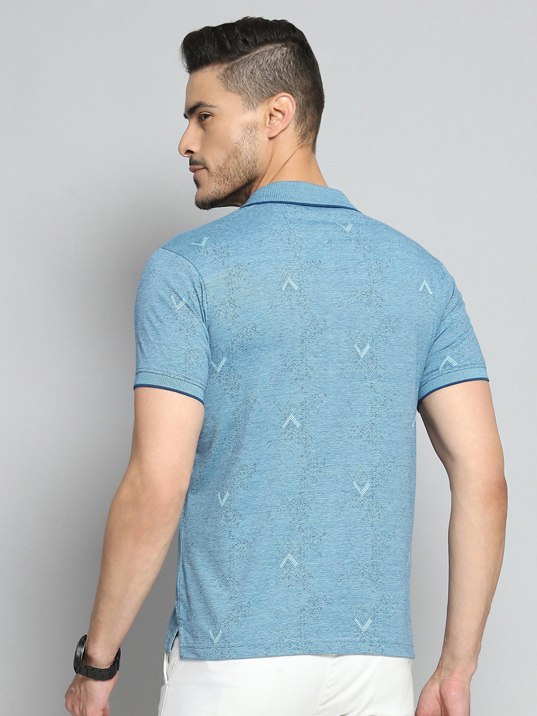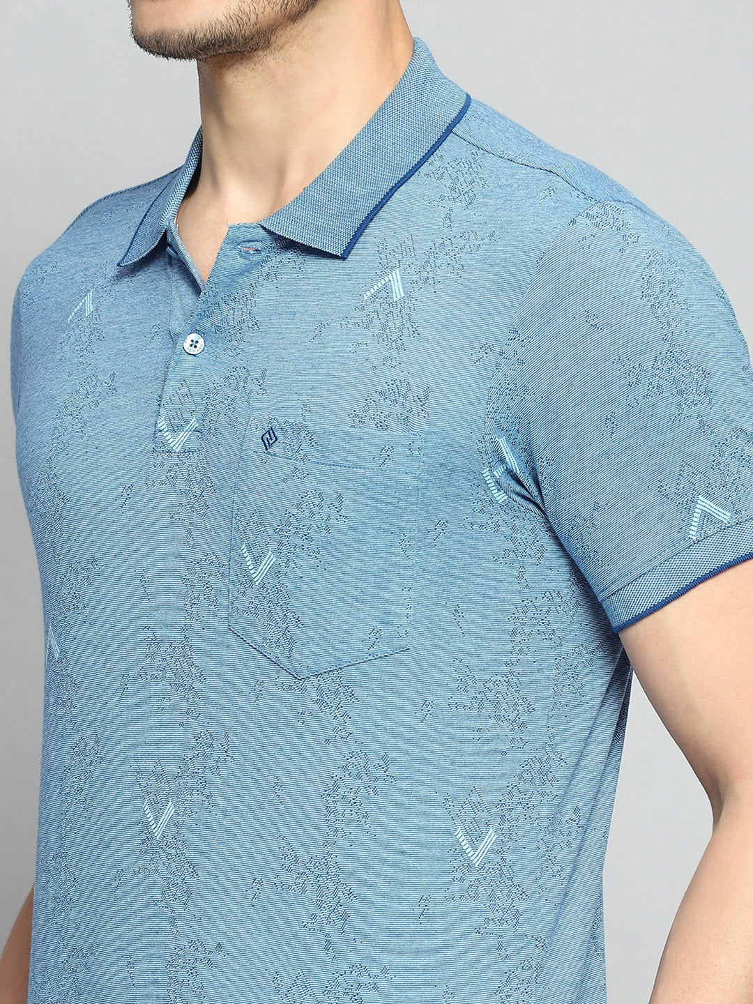 Men Blue Self Design Polo Collar Half Sleeve T-Shirt