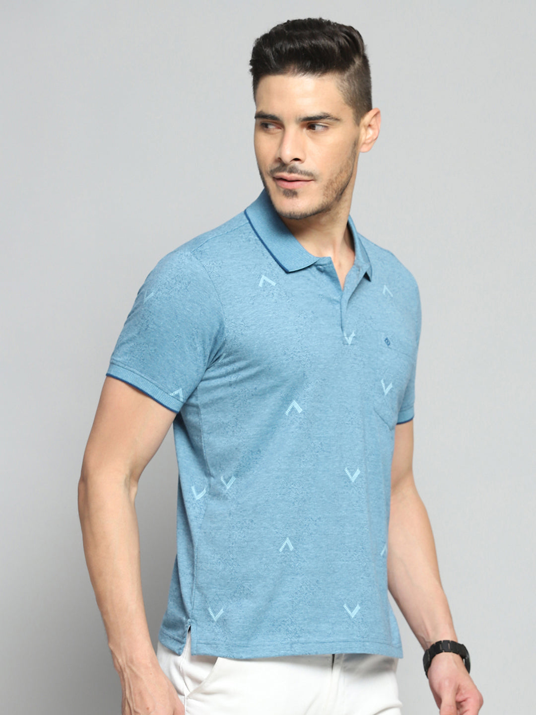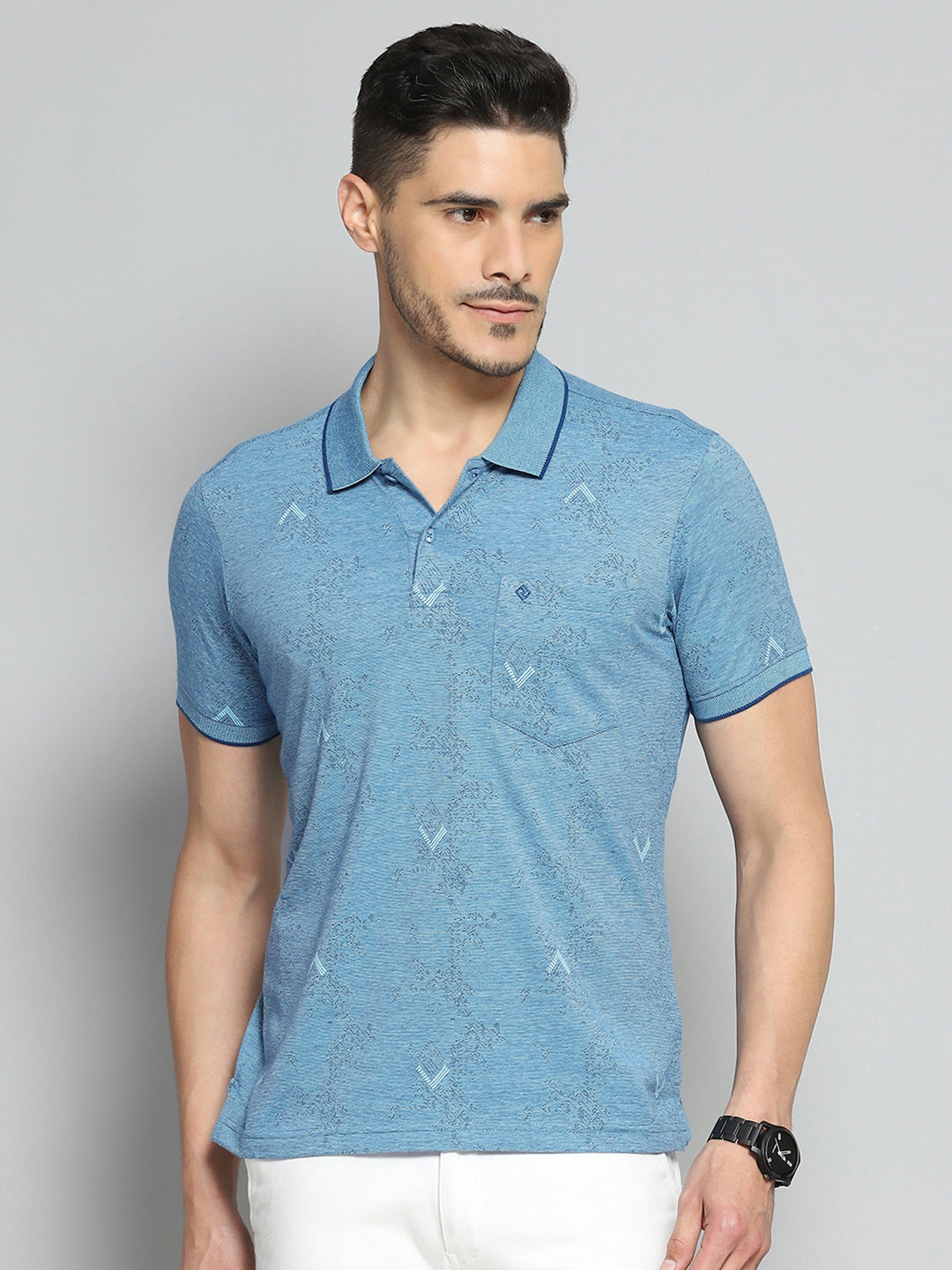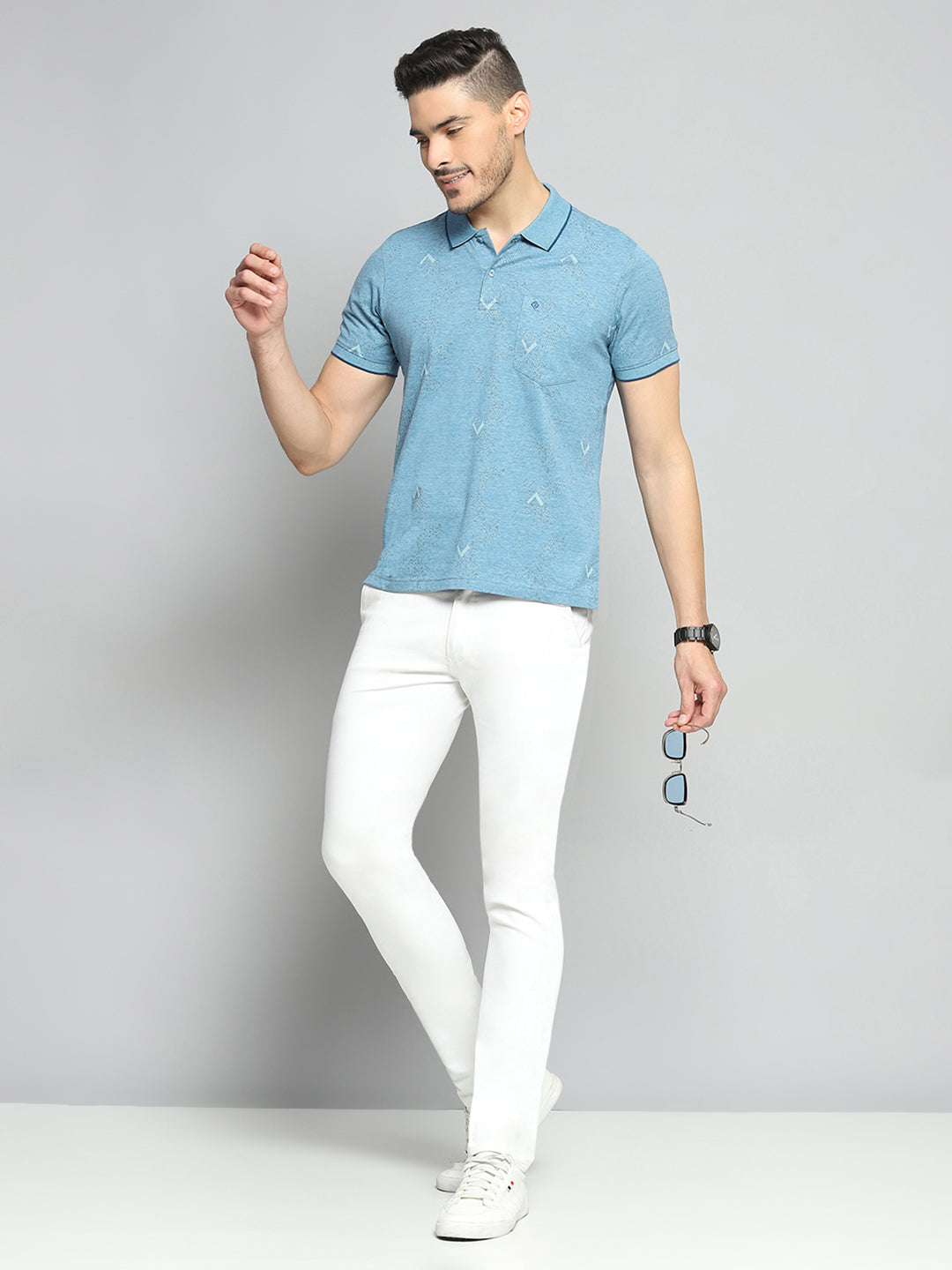 Men Blue Self Design Polo Collar Half Sleeve T-Shirt