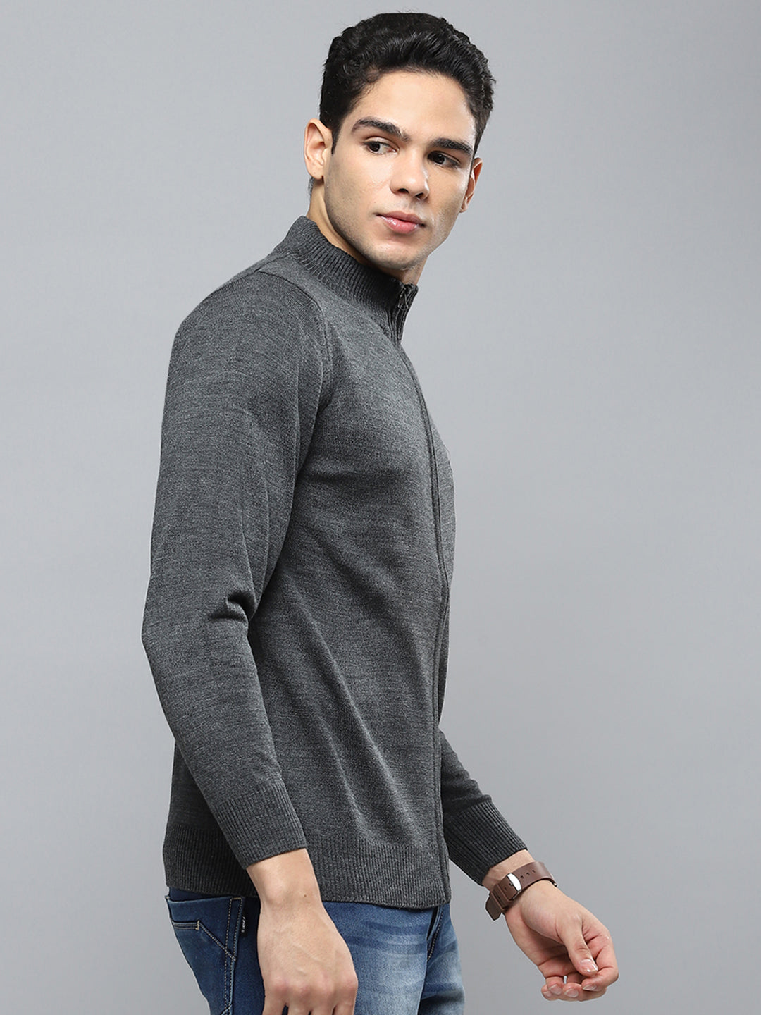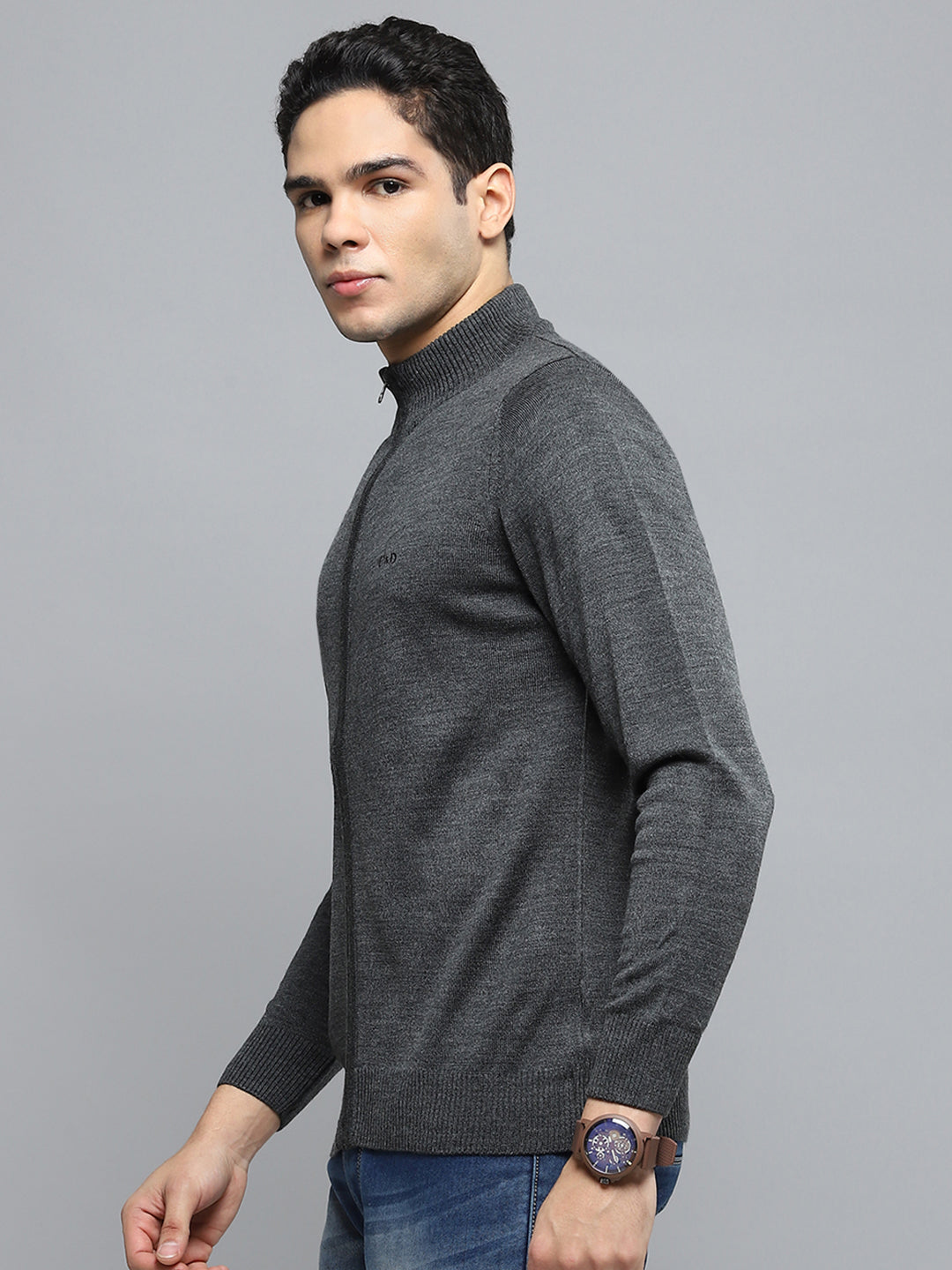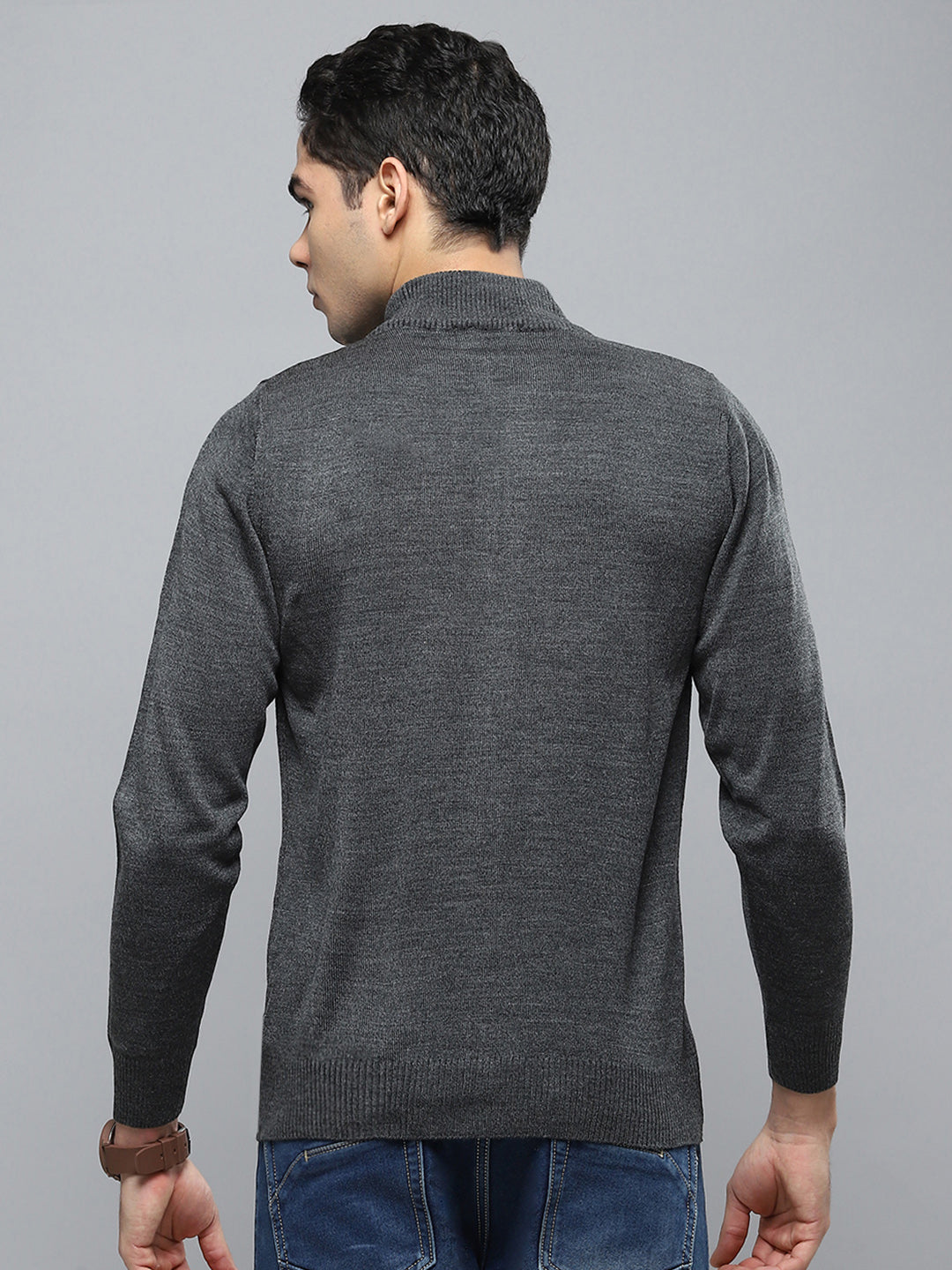 Men Grey Solid Mock Neck Full Sleeve Pullover