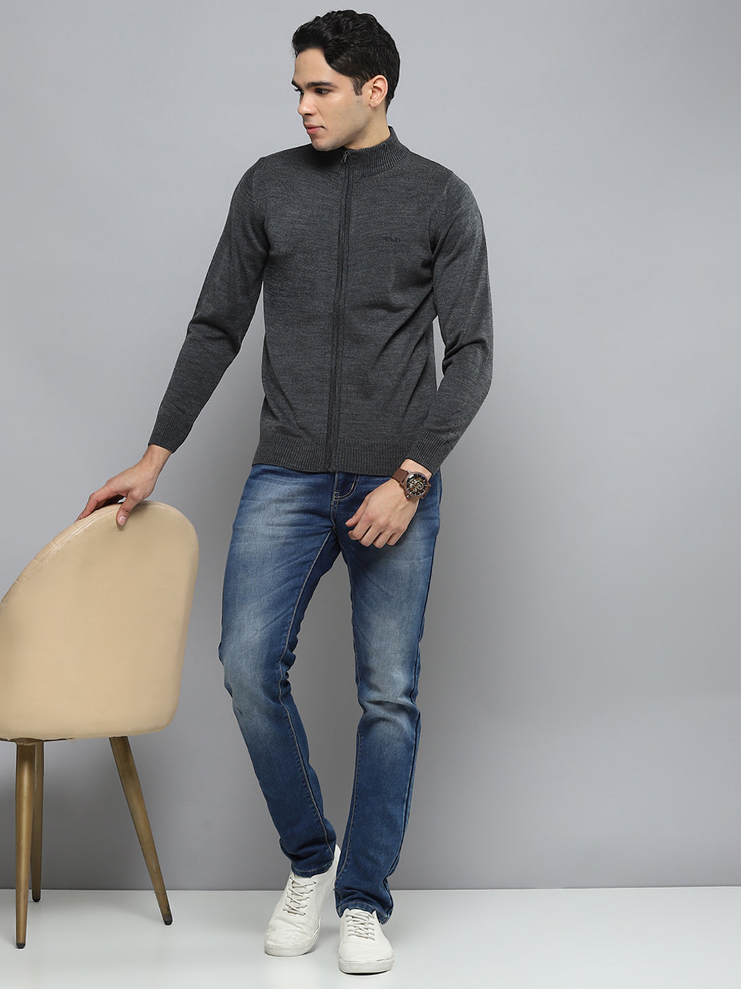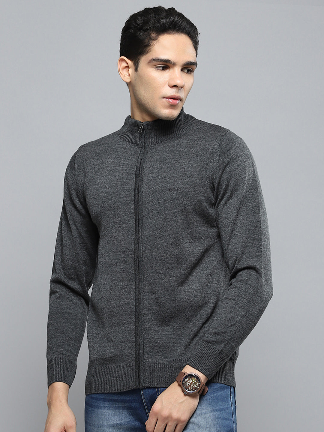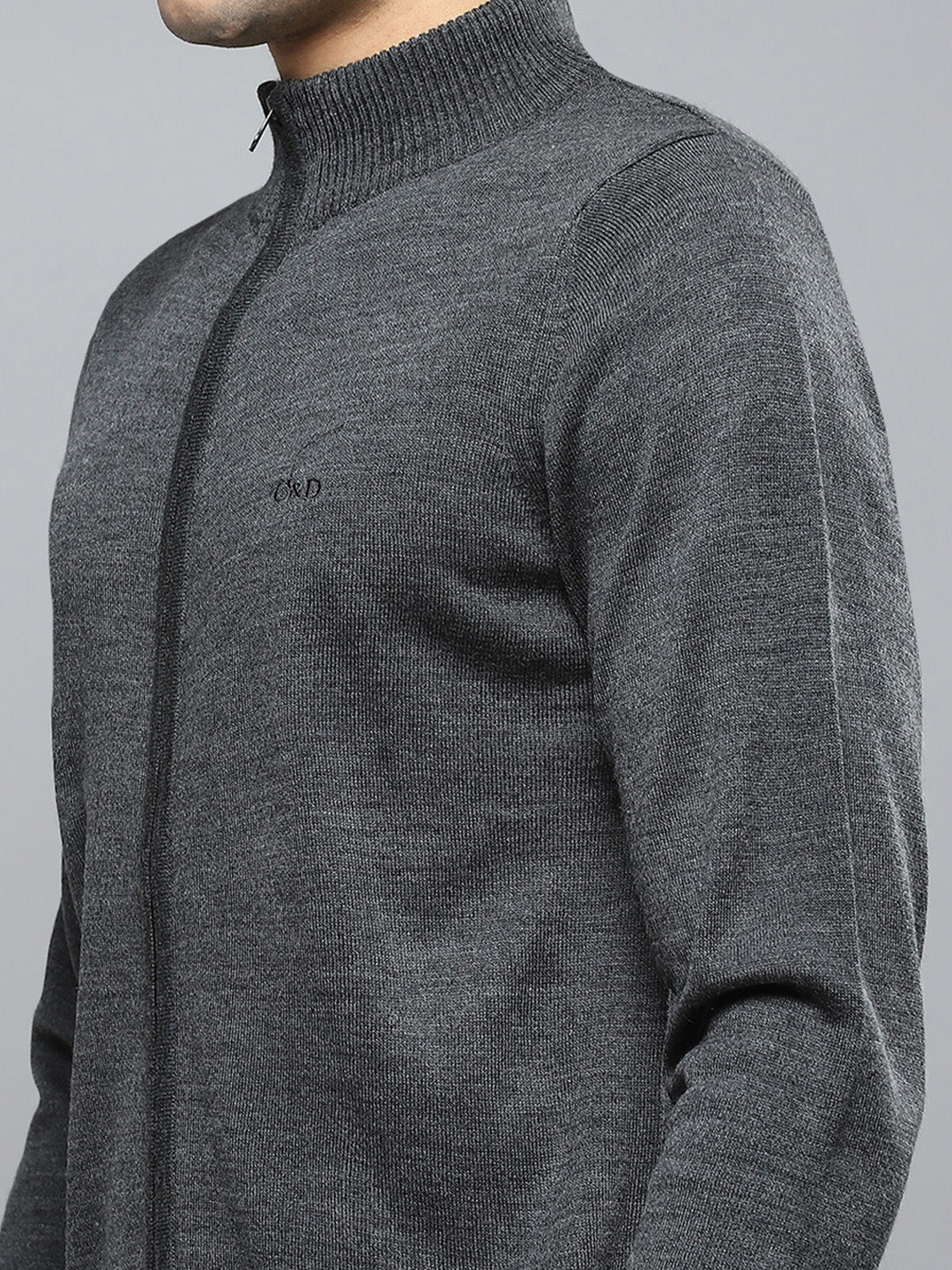Men Grey Solid Mock Neck Full Sleeve Pullover