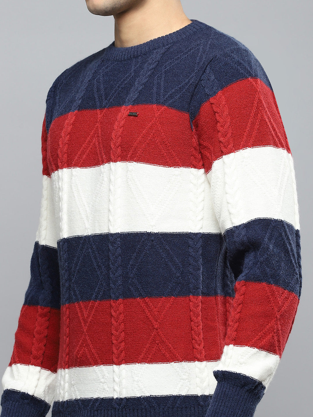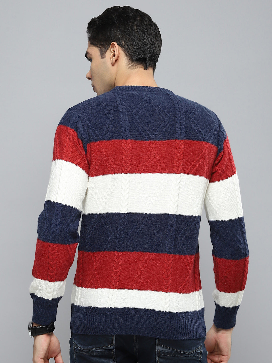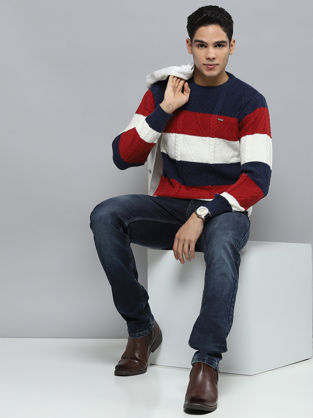 Men Navy Blue Stripe Round Neck Full Sleeve Pullover
