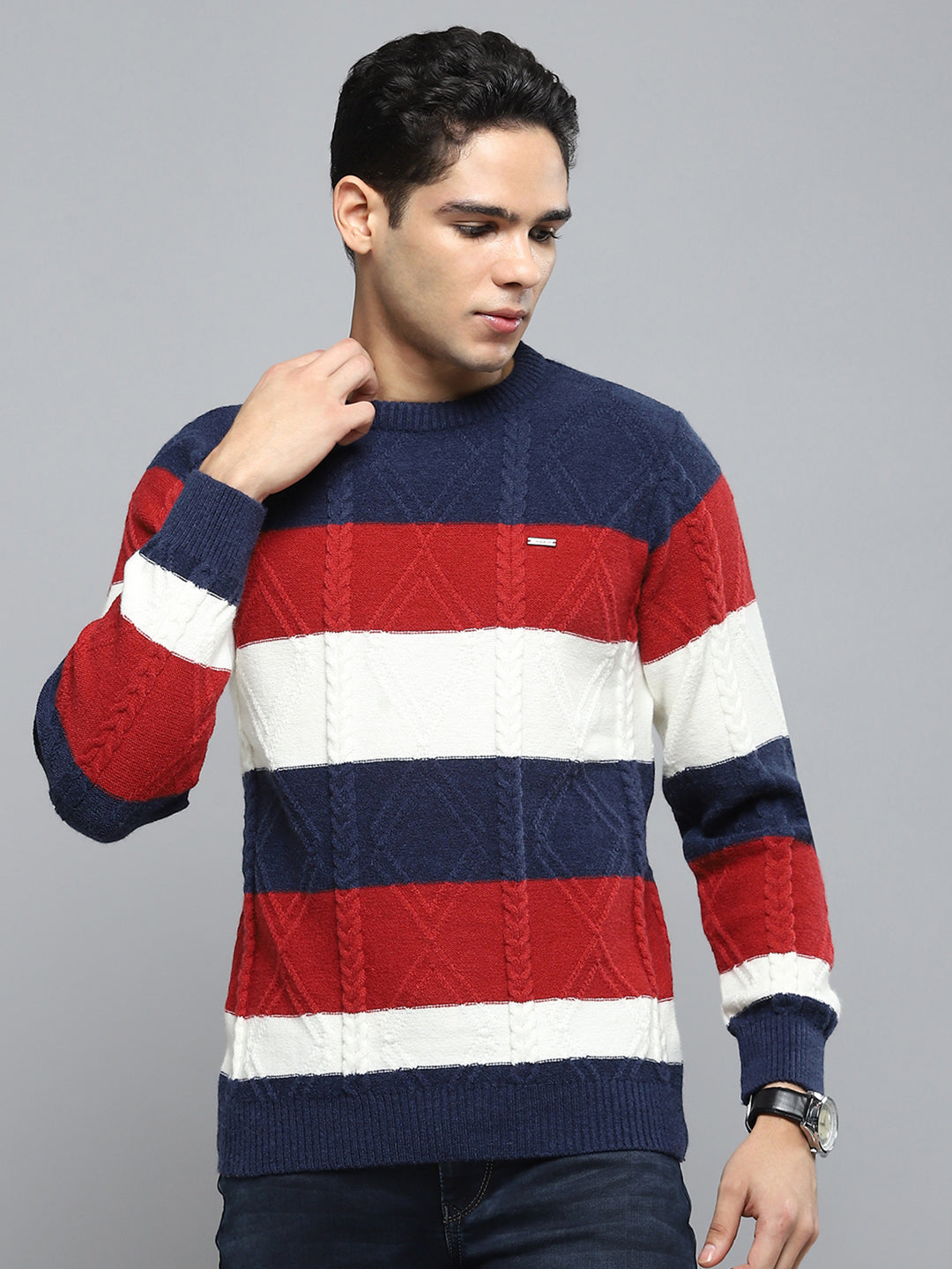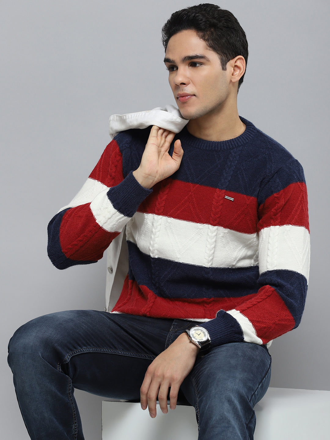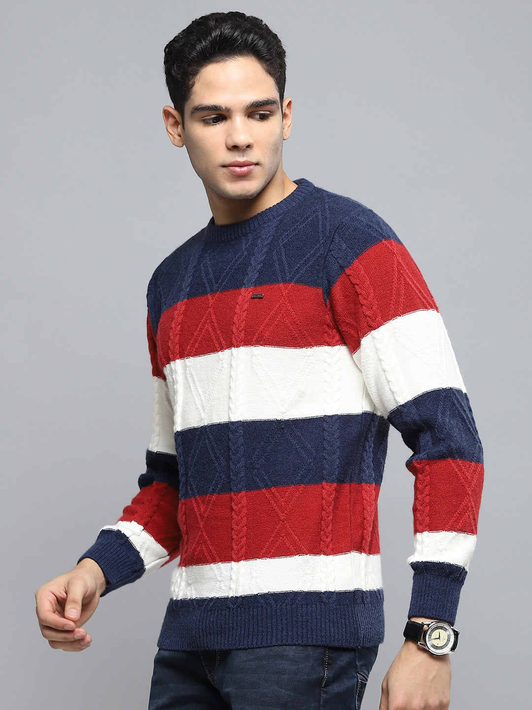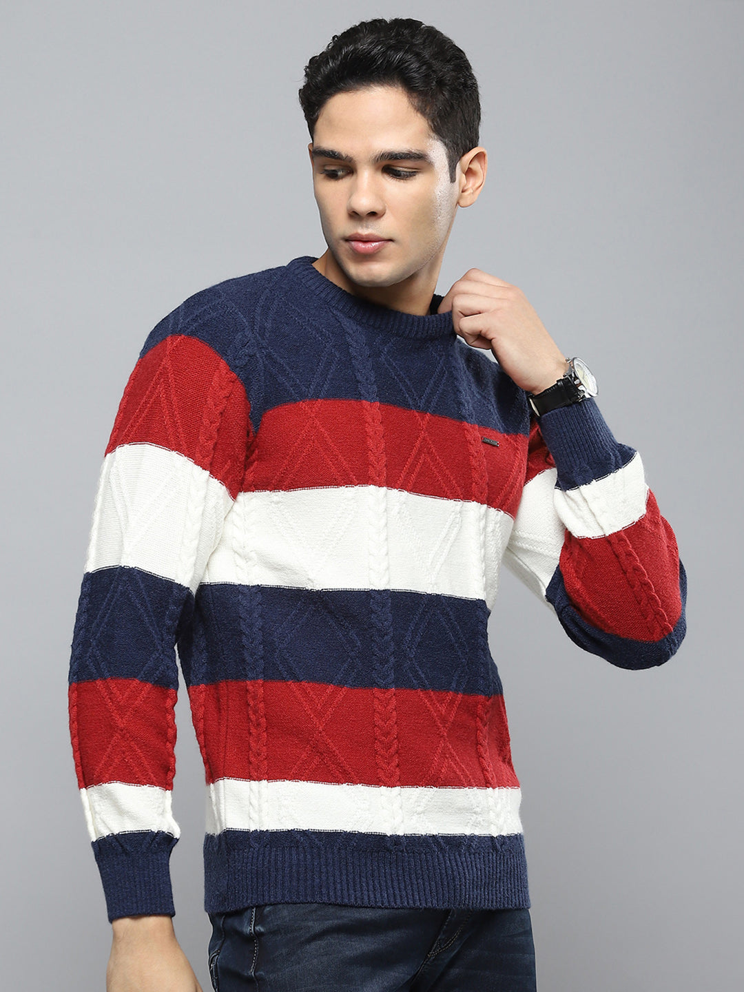 Men Navy Blue Stripe Round Neck Full Sleeve Pullover
