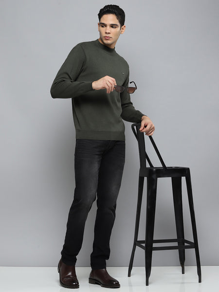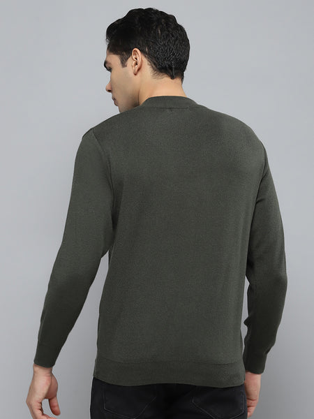 Men Olive Solid Round Neck Full Sleeve Pullover