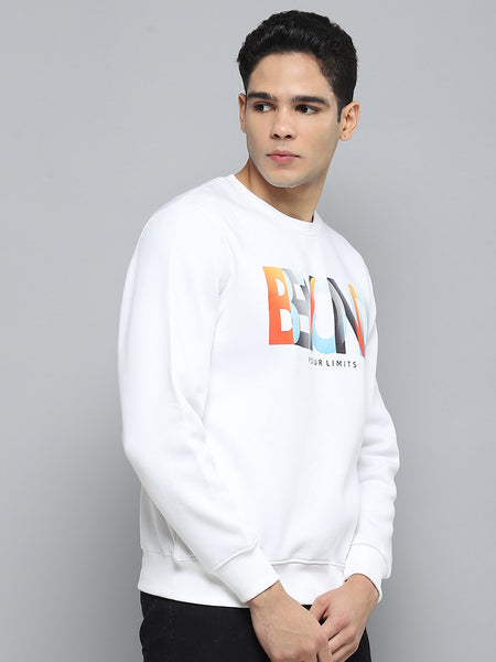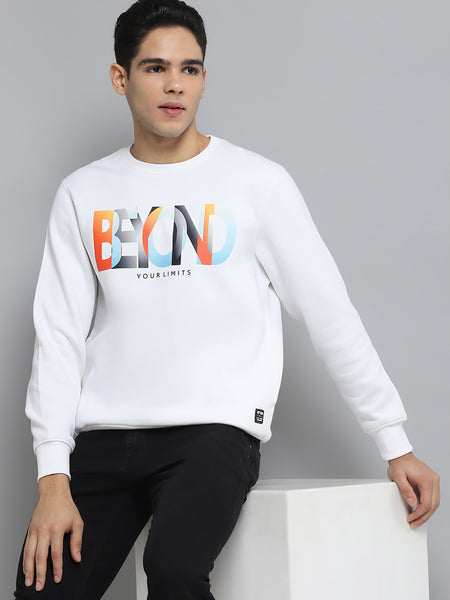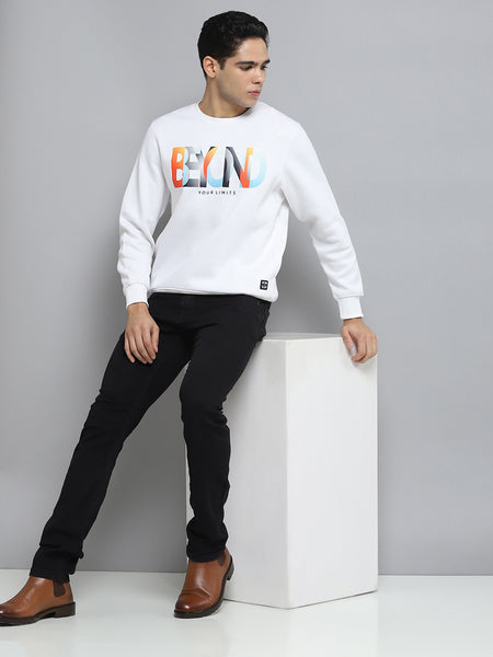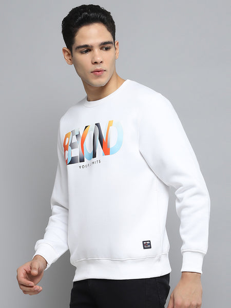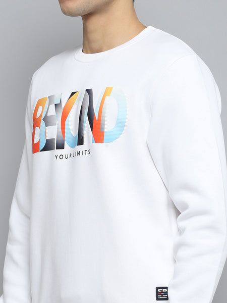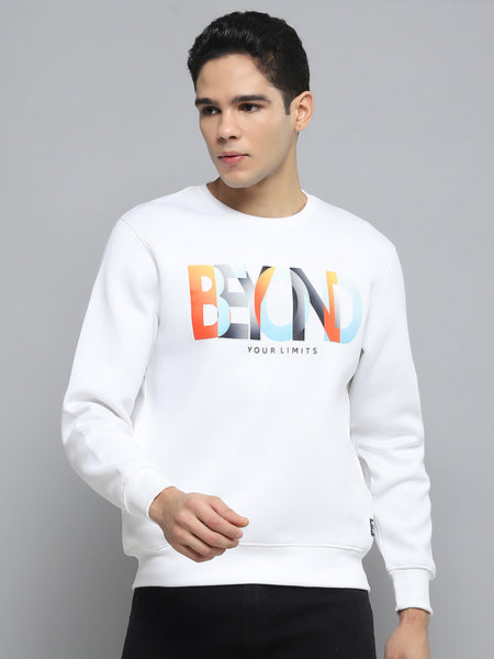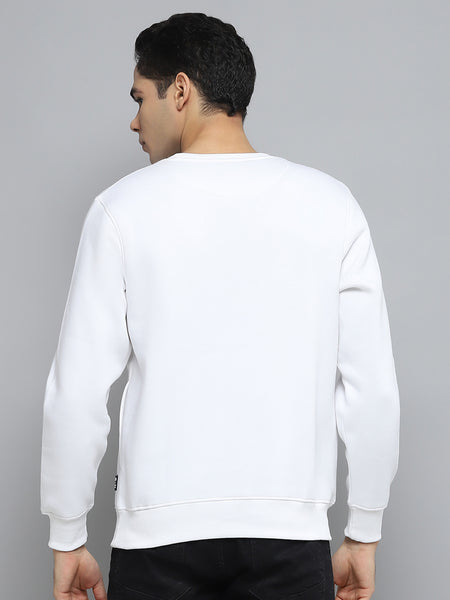 Men White Printed Round Neck Full Sleeve Sweatshirt