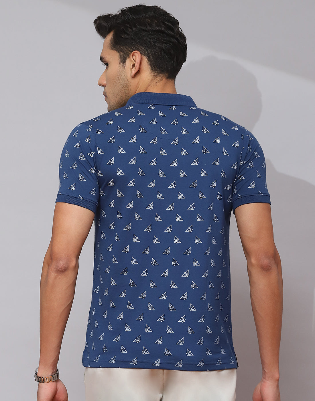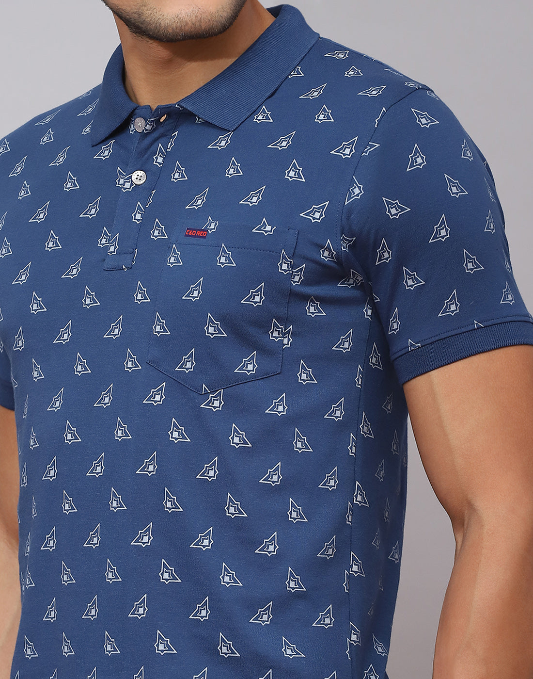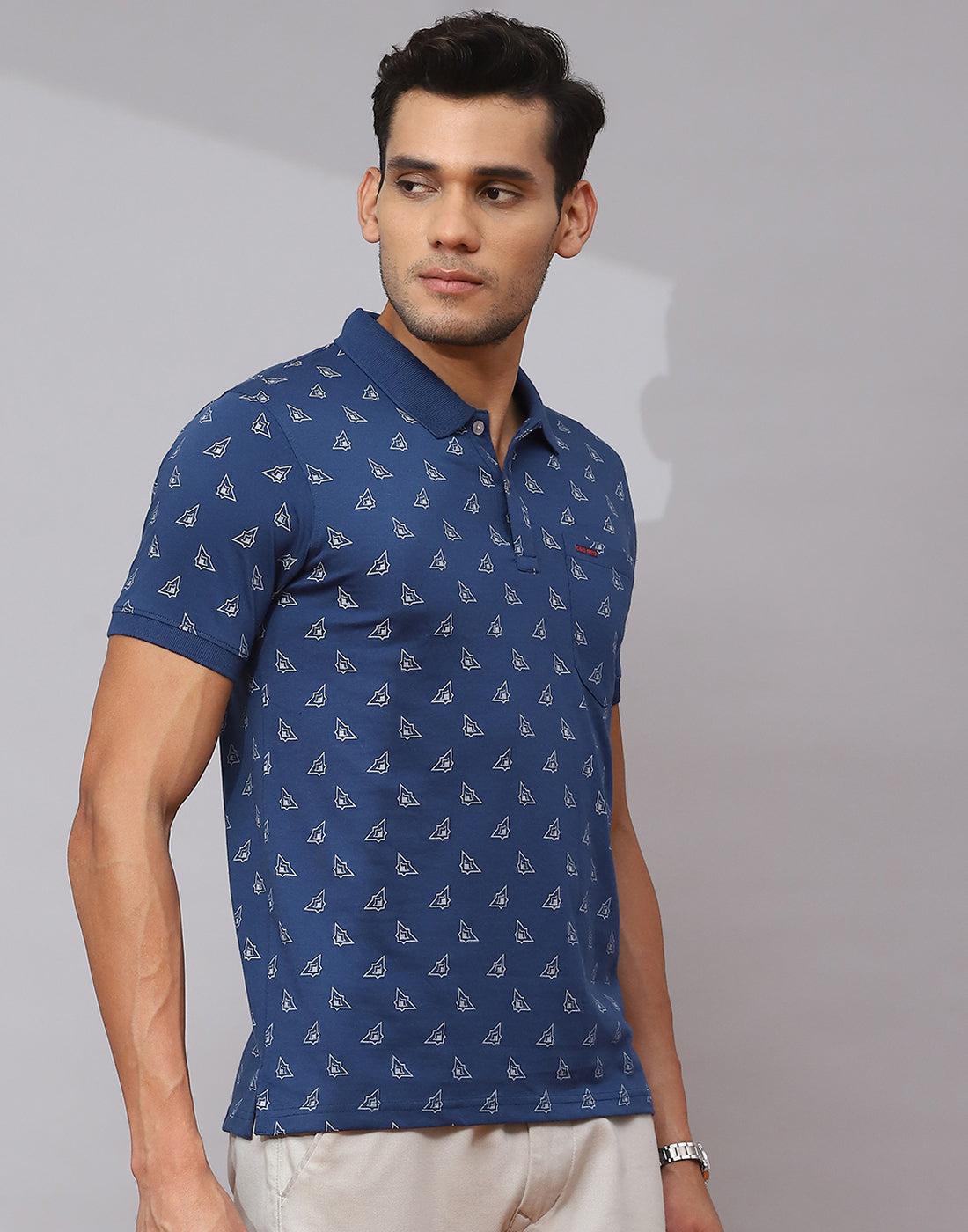 Men Blue Printed Collar Half Sleeve T-Shirt