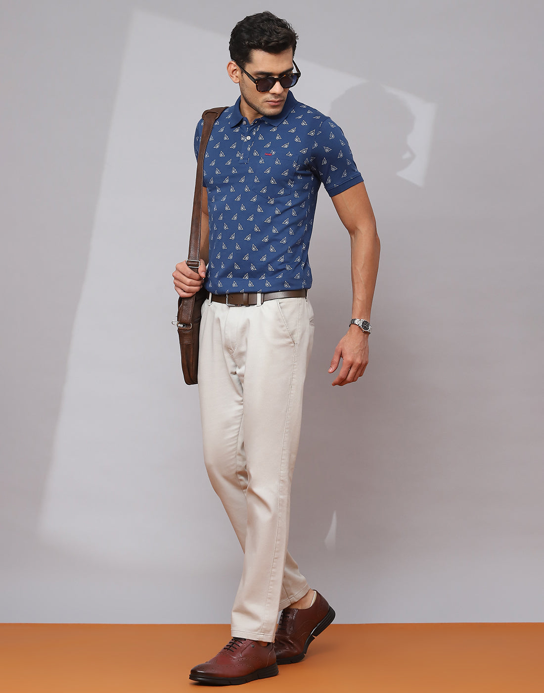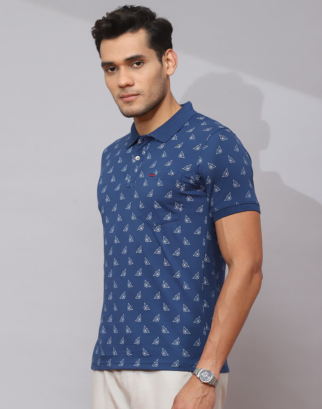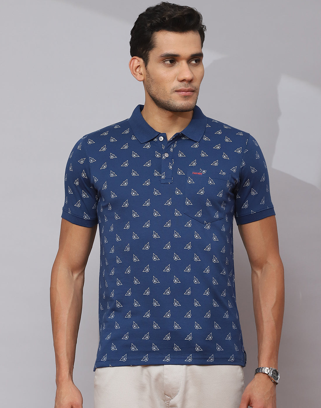 Men Blue Printed Collar Half Sleeve T-Shirt